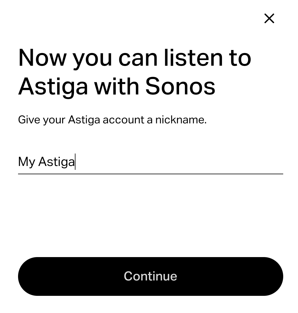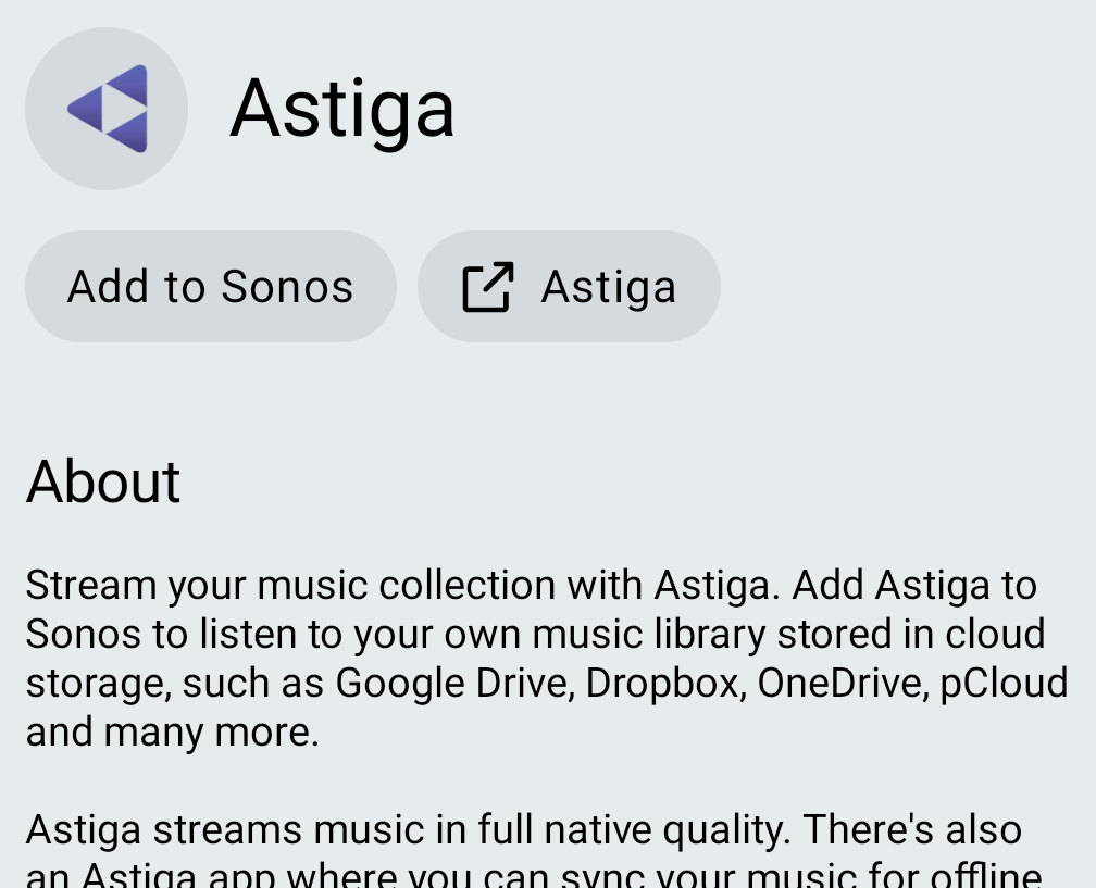 Astiga is a streaming service for your own music. By connecting Sonos to Astiga you can play your own music library on your Sonos speakers.